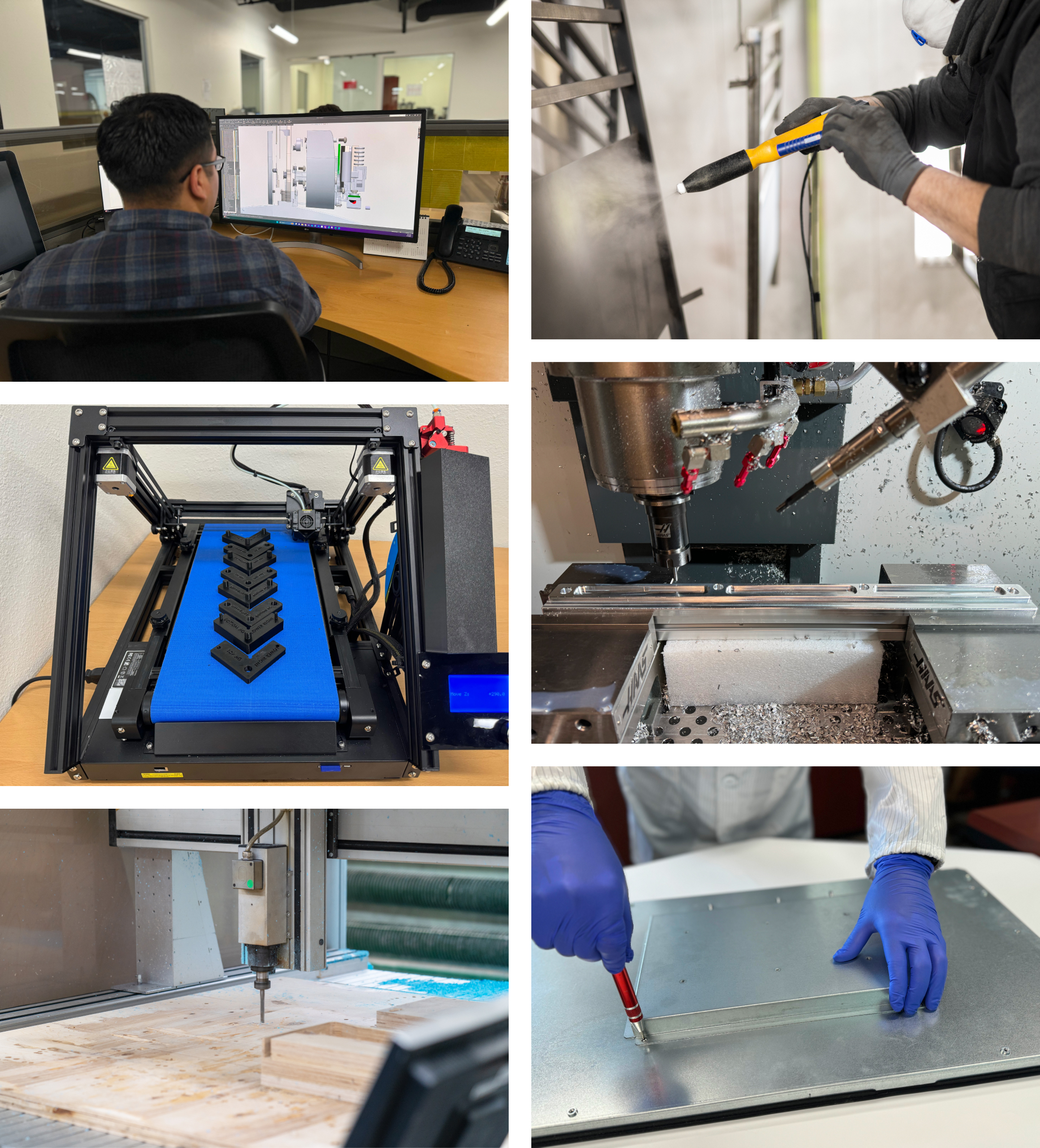 Hardware development with over a dozen available processes, including CNC machining, 3D printing, sheet cutting, and laser cutting with aluminum, honeycomb?, plastic, film, foam, and wood. Our engineers implement the latest technologies into your products.